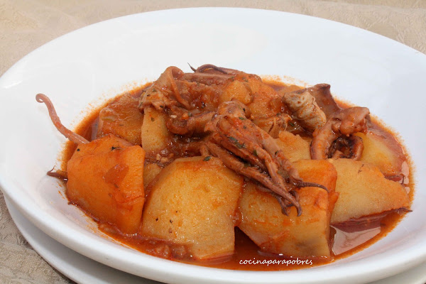 Este tipo de guisos a mi me encantan, podemos acompañar de pan para mojar, machacar las patatas con el tenedor que mezcladas con la salsita y y la pota está tremenda.. Espero que os guste.