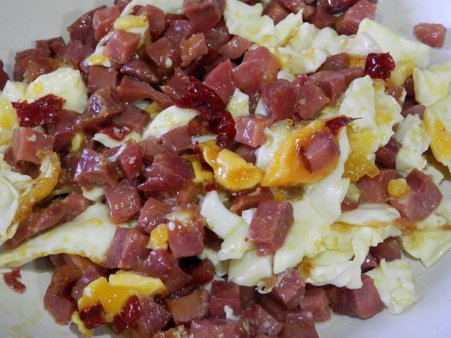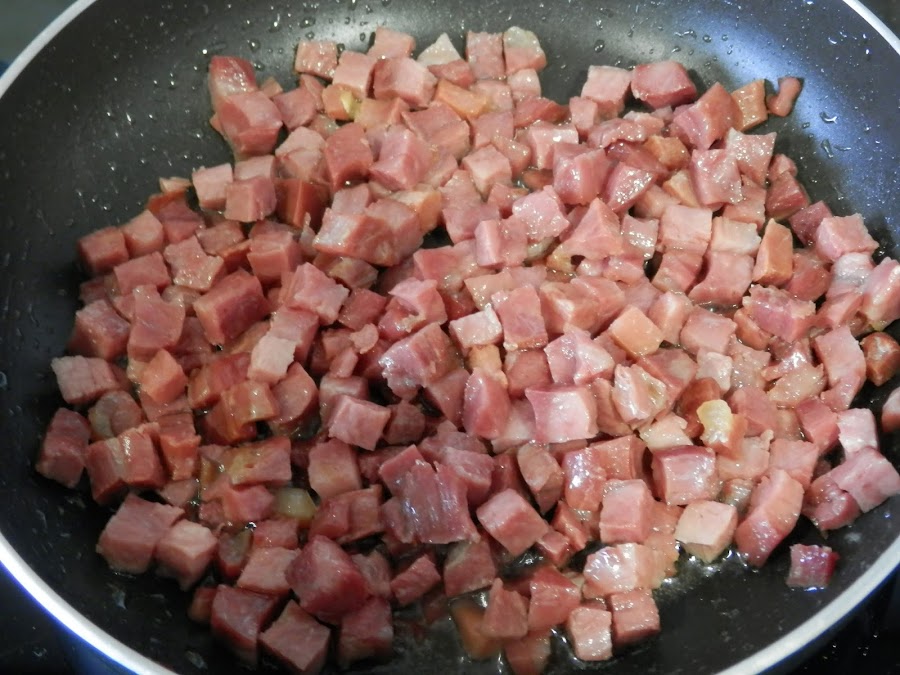 En ese aceite (si ves que es poco, añade otra cucharada de aceite) añadimos el jamón y freímos el jamón hasta que esté tostadito.