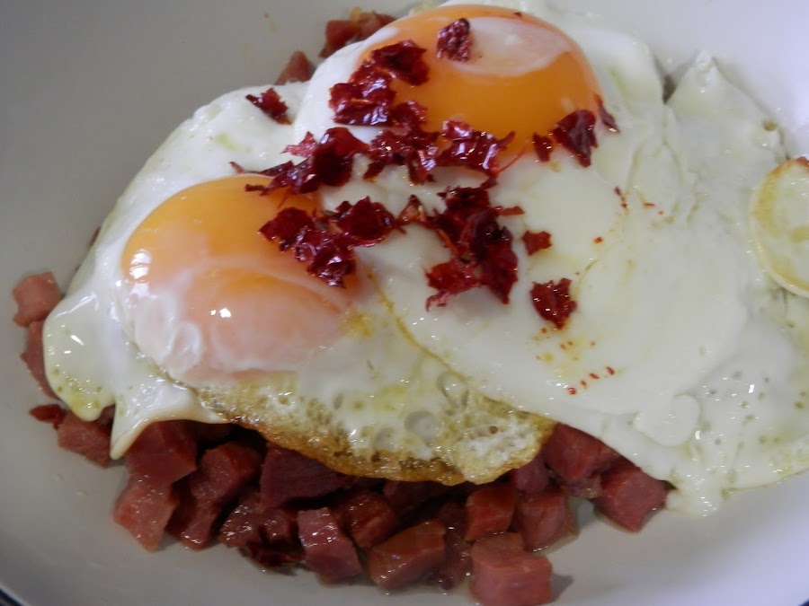 Ahora fríe los huevos hasta dejar la clara cuajada y las yemas blanditas.