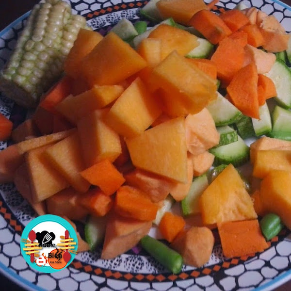 3.- Palamos la piña, la limpiamos bien. Introducimos todas las verduras en la olla. Añadimos agua hasta cubrirlas. Agregamos el azafrán, la sal y la hoja de laurel. Cocinamos 1 hora a fuego medio hasta que todas las verduras entén tiernas.