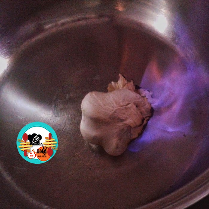 2.- Si tenemos cocina de gas, asamos al fuego (en un fogón) la cabeza de ajos y la reservamos. Si la cocina es de placa, en un cazo ponemos los ajos los rociamos con ginebra o ron y le prendemos fuego, mantenemos la llama viva hasta que se ase la cabeza entera. La reservamos.