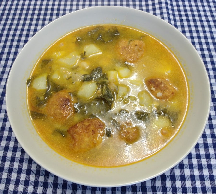 Se pone una cacerola con agua al fuego y se echan las espinacas escurridas,las patatas cortadas a trocitos, los tomates pelados y triturados, los garbanzos, la cebolleta el majado, el comino, pimentón y el laurel. Cuece durante 20 minutos echa las albondigas y prosigue la cocción 10 minutos mas y sirve.