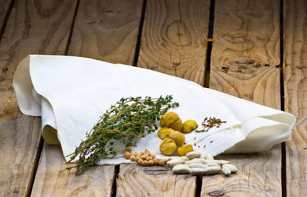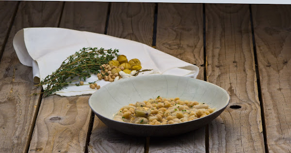 Dentro de la cocina italiana hay muchas referencias a las lentejas con castañas. En mi caso, he preferido cambiar los ingredientes principales pero manteniendo ese base sencilla, parca y austera de un plato caliente realizado por un joven sirviente. Os aconsejo que le agreguéis una punta de jamón. El potaje no puede ser más rico. La mezcla del tomillo fresco y el orégano le da un sabor buenísimo. Y la mezcla de castañas con las alubias y garbanzos es fantástica.