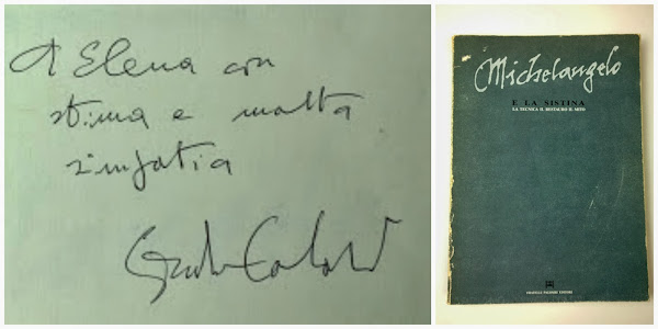 Hace unos cuantos años asistí a un curso en la Universidad de La Laguna impartido por Gianluigi Colalucci, Director del proyecto de restauración de la Capilla Sixtina y Asesor de los Museos Vaticanos. Era un tema técnico sobre la limpieza de las pinturas de Miguel Ángel. En cuanto pude, le hablé de mi fijación con Miguel Ángel y de lo que me hubiera gustado subir con él para ver las pinturas de cerca. Lógicamente yo me fuí cargada con uno de mis libros favoritos, y le pedí que me lo dedicara. "A Elena con stima e molta simpatia". Bueno, finalmente no pude llegar a los diez centímetros de distancia de las pinturas, pero pasé unas horas maravillosas escuchando todos los detalles de la restauración de la persona que había liderado dichos trabajos.