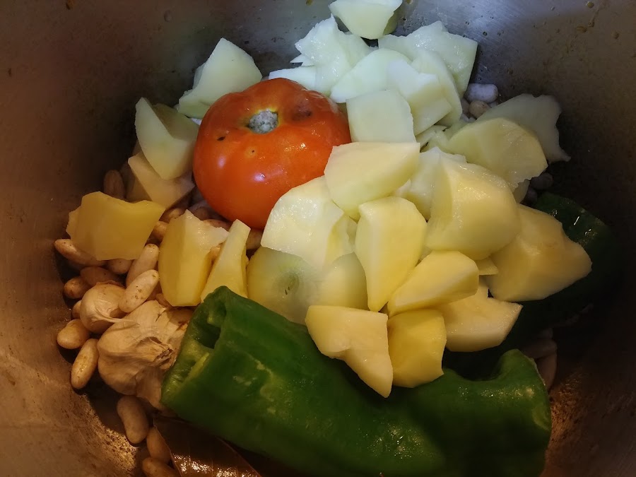A continuación la cebolla entera pelada, el tomate entero, la media cabeza de ajos, el pimiento verde entero y las patatas peladas y cortadas a trozos.