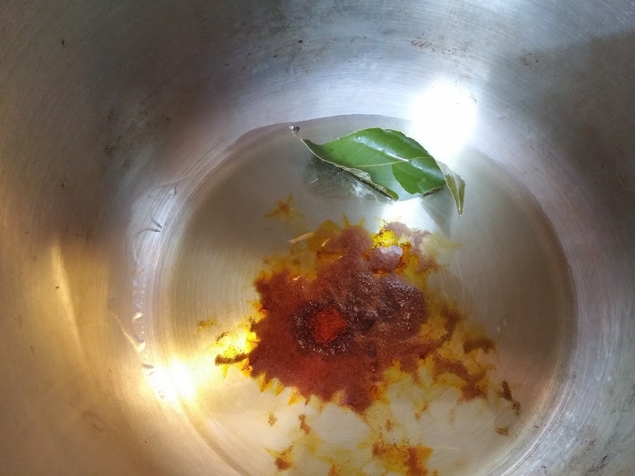 En la olla exprés echamos un chorreón de aceite de oliva, lo calentamos y añadimos la hoja de laurel, una cucharadita de pimentón dulce y media cucharadita de pimentón picante. Removemos.