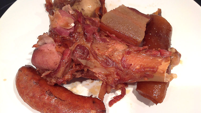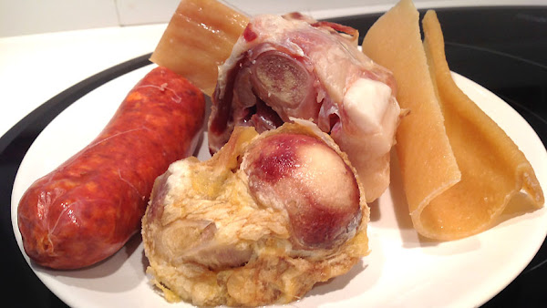 Estas son las "carnes" que utilizo. Chorizo, hueso de jamón serrano, tocino, pellejo y hueso de cerdo añejos -curados en sal-. Al final añadiré la morcilla.