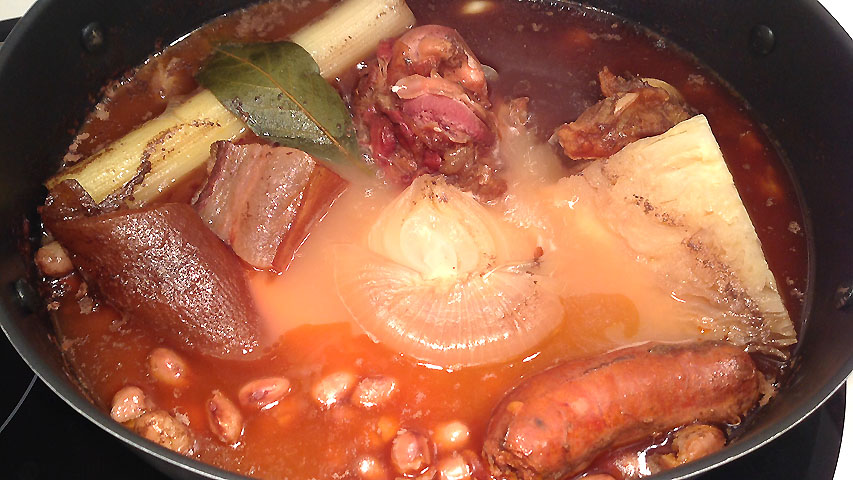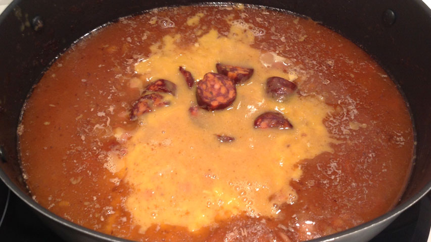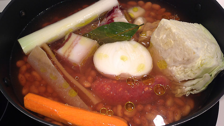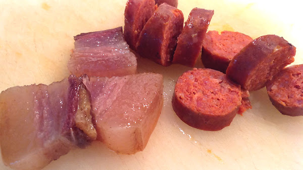 El tocino y el chorizo troceados y listos para zambullirse en la olla.