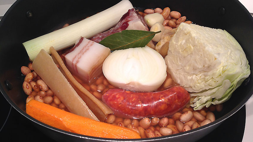 Todos los ingredientes que introduzco en la olla están listos. No pongo sal porque los huesos y el pellejo aportan suficiente.