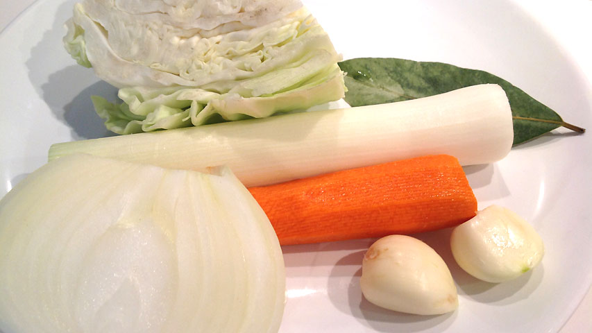 Aquí "lo verde": cebolla, zanahoria, puerro, col, ajos y laurel.
