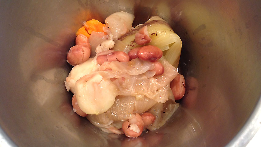 Una vez cocidas retira a un lado las carnes y las verduras (menos la col) ponlas en un vaso de la trituradora.