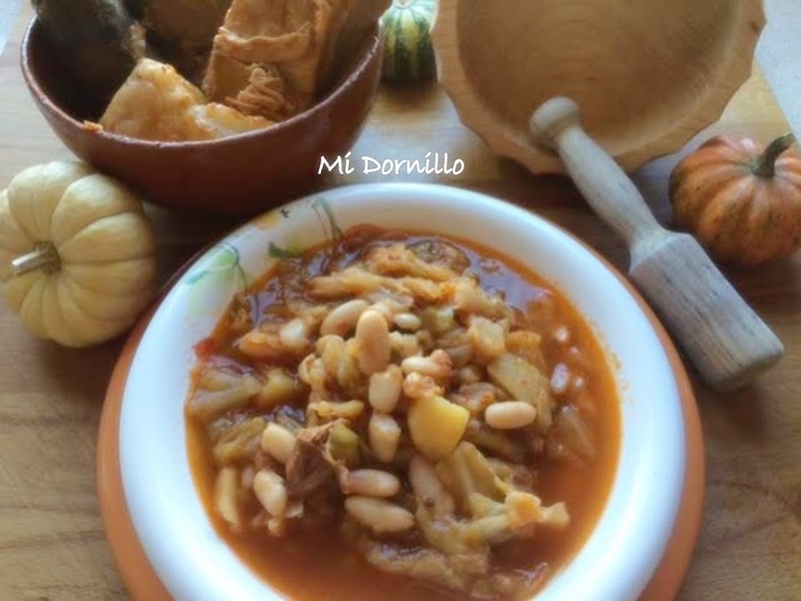 Ponemos la carne, la costilla, los tocinos, y las judías blancas en una olla grande a cocer, poco a poco iremos espumando, ya que suelta espuma. A la media hora le añadimos la col picada a cuadraditos.