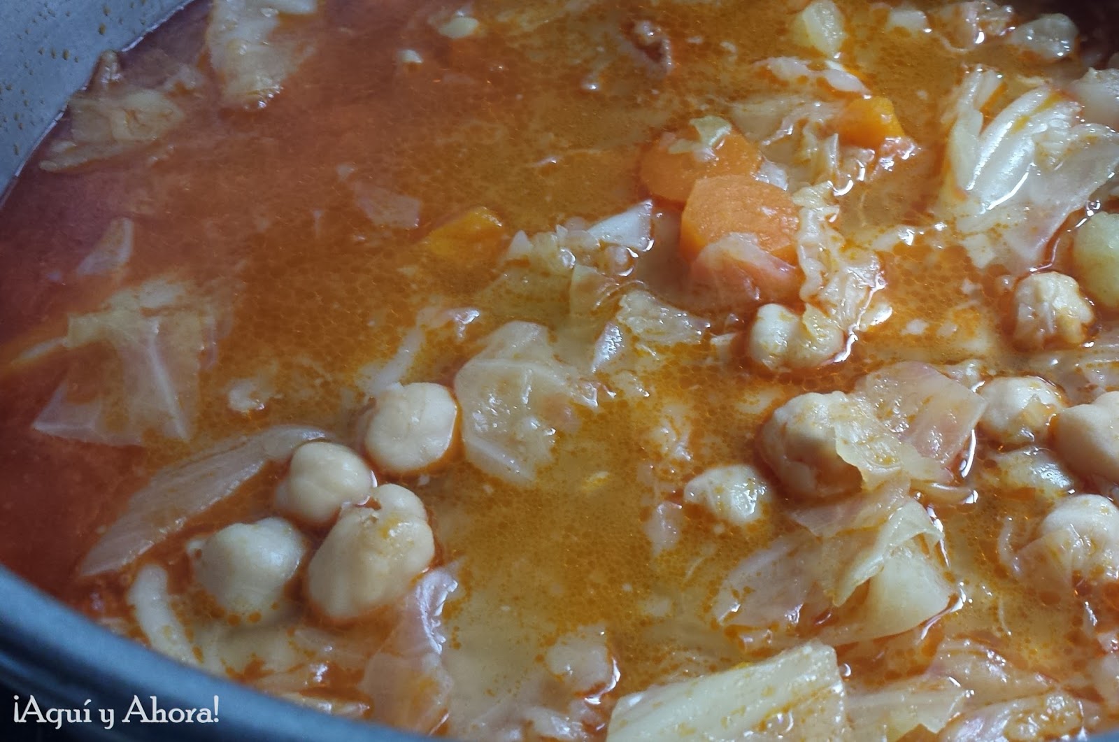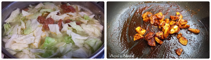 Cuando veamos que ya deja de salir espuma añadiremos la col, los chorizos, la pizca de comino y la sal. Mientras que la col se va ablandando poco a poco, en una sartén con un chorrito de aceite añadimos los ajos cortados en láminas, cuando estos estén ligeramente dorados añadiremos el pimentón, bajamos el fuego, removemos, lo dejamos unos minutos con cuidado que no se nos queme y se lo agregamos a la olla. Si vemos que queda algún resto de pimentón agregamos un cucharón del caldo a la sartén removemos y se lo añadimos a la olla.
