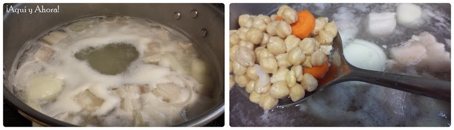 Ponemos al fuego la olla exprés con agua y cuando esté caliente, introducimos los garbanzos, la cebolla, las zanahorias, las patatas y la panceta. Empezará salir una espuma en la superficie que iremos quitando con la ayuda de una espumadera o cucharón.
