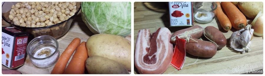 Al día siguiente, le quitamos el agua de los garbanzos, lavamos bien la col y la troceamos. Pelamos y cortamos en rodajas la zanahoria. Troceamos los chorizos, la panceta y la cebolla.