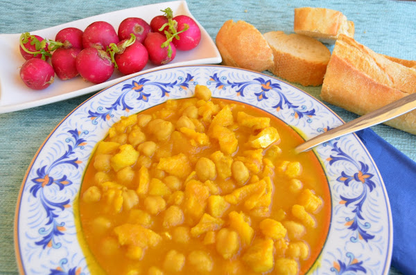 Introducimos los garbanzos y el bacalao desmenuzado, el pimentón y el colorante, añadimos agua hasta que los garbanzos estén cubiertos, mezclamos bien y dejamos a fuego unos 15 o 20 minutos.