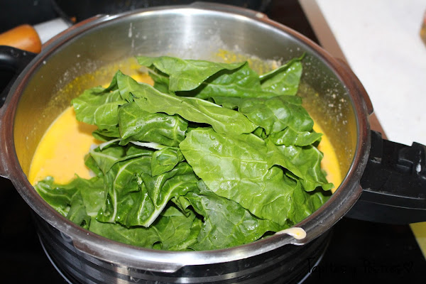 Y las hojas de las acelgas bien lavadas y troceadas. Las hundimos un poco en el caldo, ya veis que abultan mucho aunque luego se reducen considerablemente. Cocinamos unos 8 minutos.