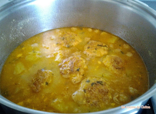Cuando podamos abrir la olla, añadimos las albóndigas, un majado con el ajo, perejil, azafrán de pelo y el huevo duro, probamos de sal y sin cerrar la olla cocemos a fuego lento durante 5/10 minutos más.
