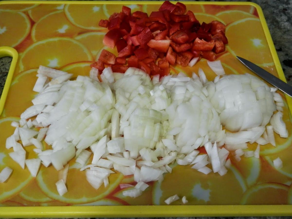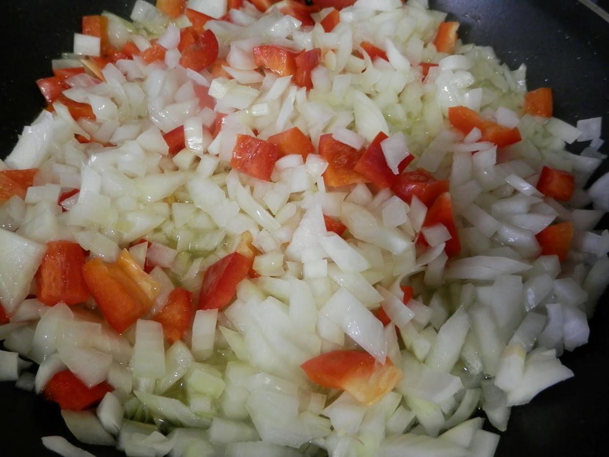 En una sartén ponemos aceite a calentar, cuando ya esté caliente añadimos la cebolla y el pimiento y sofreímos.