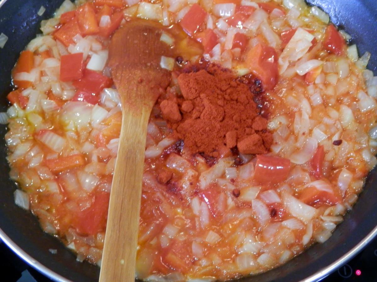 Cuando ya esté, añadimos el pimentón y un poco de agua y apartamos del fuego para que el pimentón no se queme.