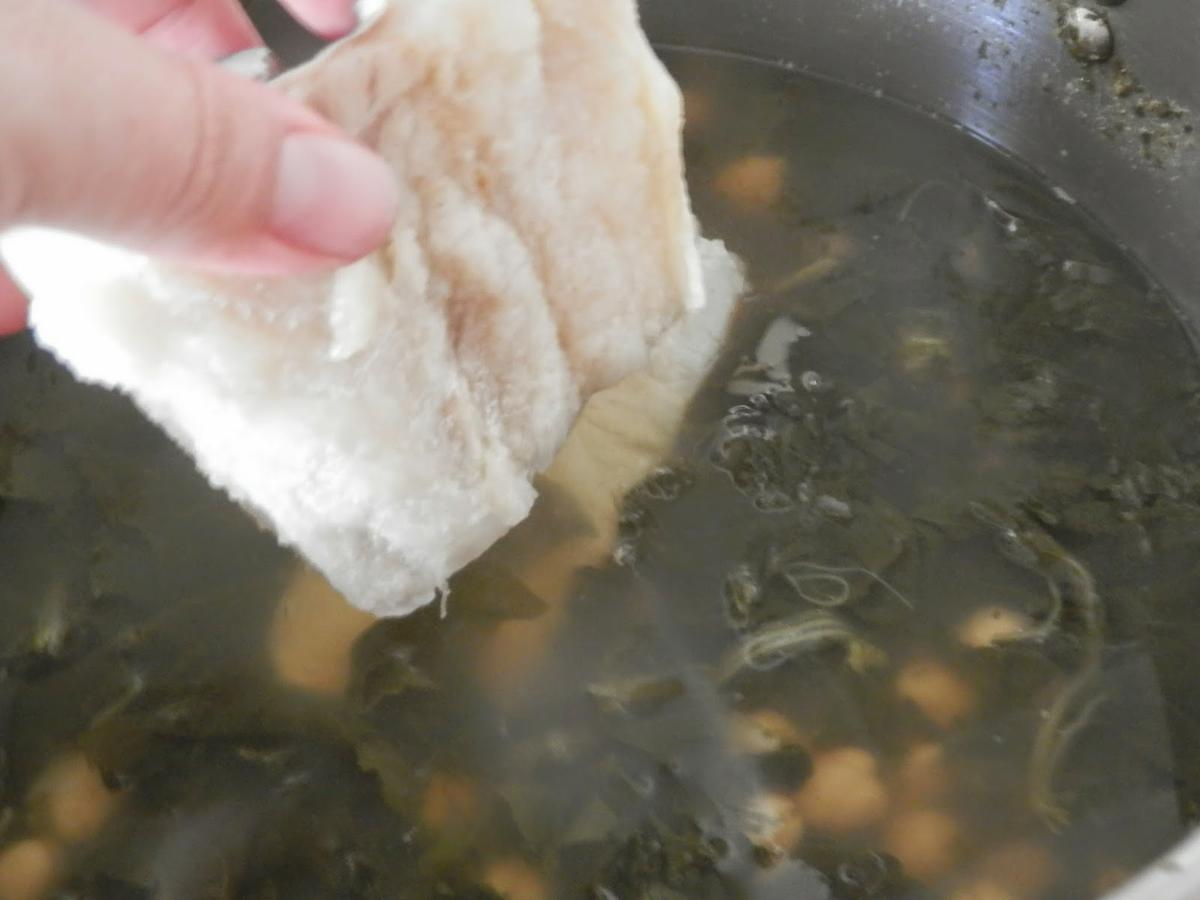 Cuando estén los garbanzos cocidos, añadimos el bacalao.