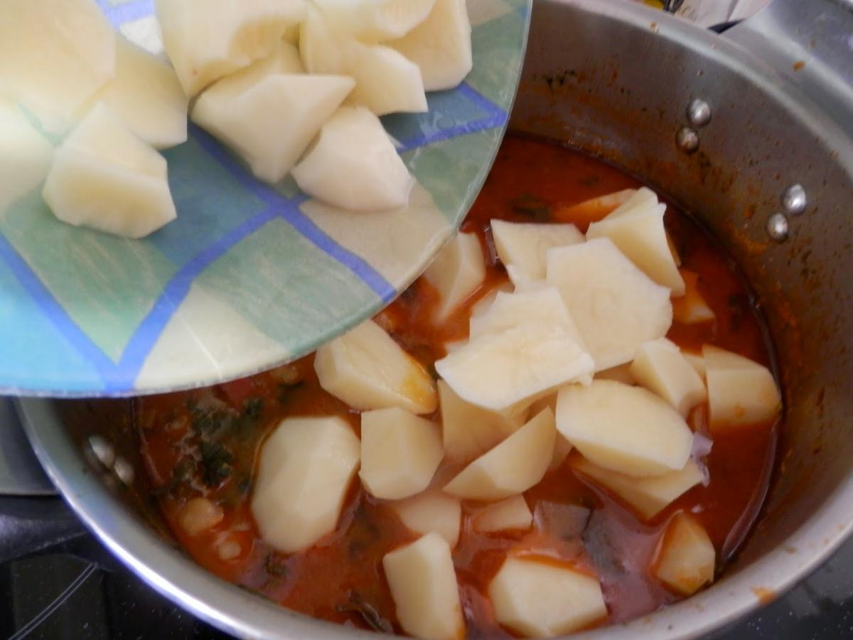 Pelamos las patatas y las cortamos, añadimos la patata al puchero y dejamos cocer hasta que esté bien cocinada.