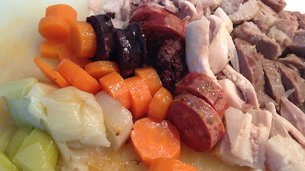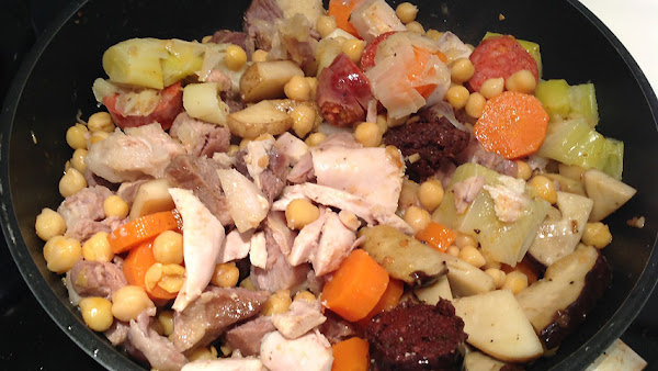 Una vez cocido, separa las carnes, las verduras, los garbanzos y el caldo.