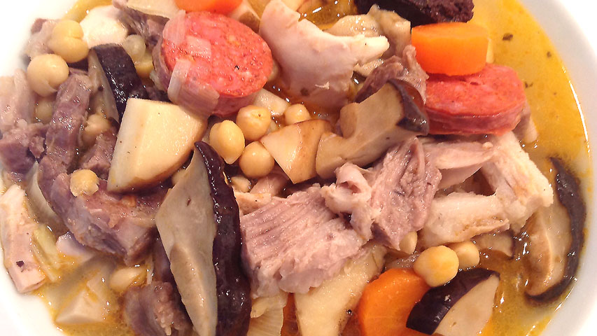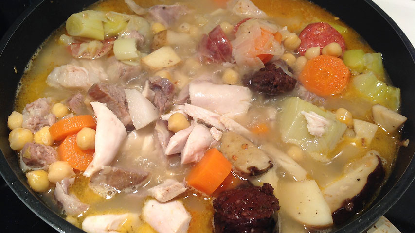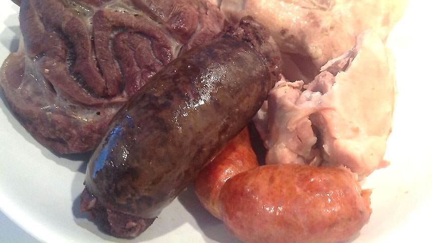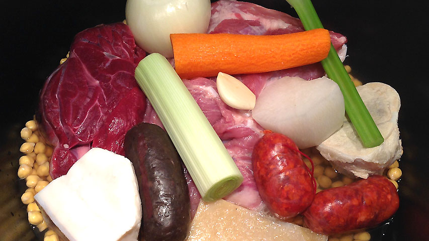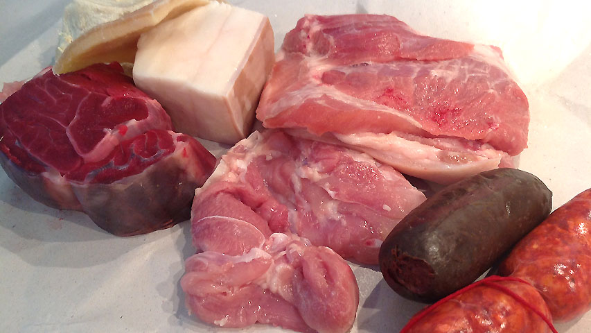 Las carnes a utilizar: ternera, cerdo y pollo. Chorizo, morcilla y tocino fresco. Además un hueso y un pellejo añejo de cerdo.