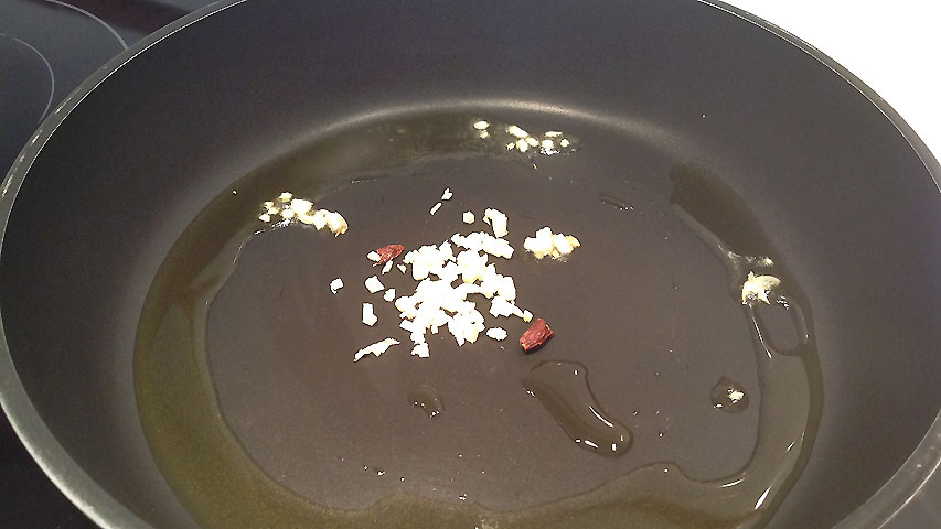 En una sartén sofríe un par de ajos picados con unas cayenas a fuego alto.
