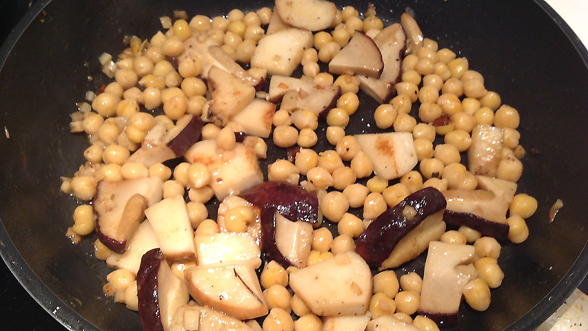 Añade una copa de vino fino y deja evaporar el alcohol antes de incorporar garbanzos, carnes y verduras.