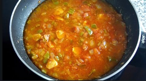 Luego, rehogamos el pimentón durante unos 20 segundos, no más tiempo para que no se nos queme porque sino amarga, y rápidamente, añadimos medio vaso de agua.