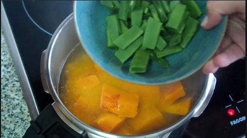 Ahora, una vez que haya bajado la pesa de la olla la abrimos, añadimos el sofrito batido, la calabaza y las judías verdes. Agregamos una cucharadita de sal.