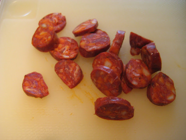 4. Vamos troceando el chorizo y lo agregamos. Dejar hacer.