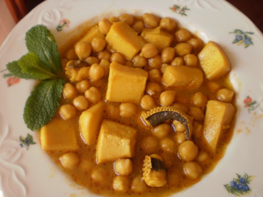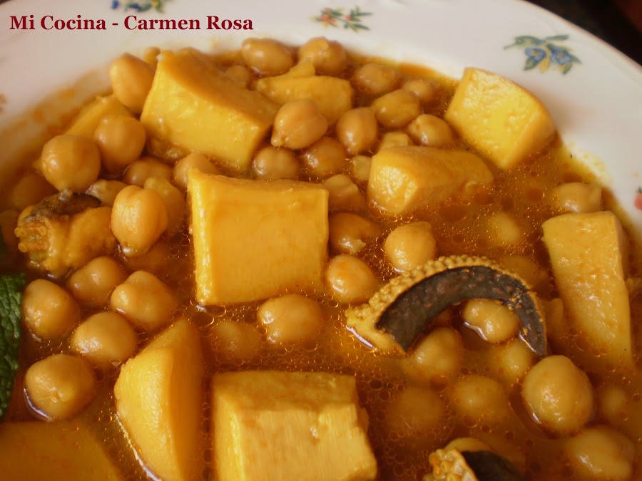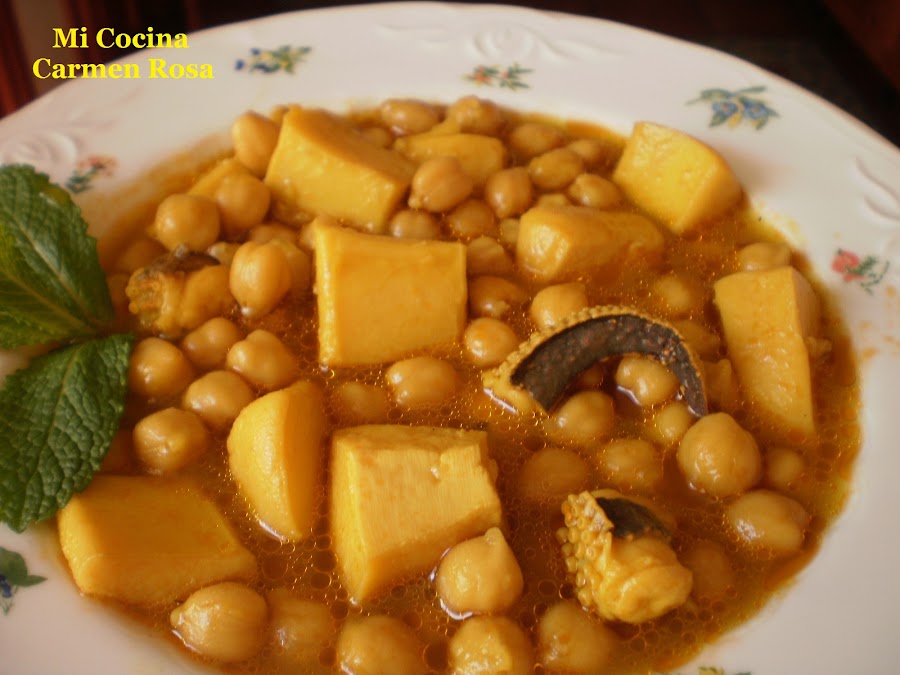 Hoy con unos tiernos y blancos garbanzos de nuestra Andalucia, unos castellanos…¿O debo llamarlos como antaño: garbanzas? y media jibia de dos kilos de peso, he preparado éste tradicional potaje tan tradicional de las provincias, tanto malagueña como gaditana, donde es en ésta última, en la zona colindante a la provincia de Málaga, añadiéndole chorizo y manteca de cerdo, se convierte en el tradicional menudillo gaditano, pero al que no le puede faltar ése maravilloso cefalópodo que tanto me gusta: la jibia (choco, chopo, sepia…..).