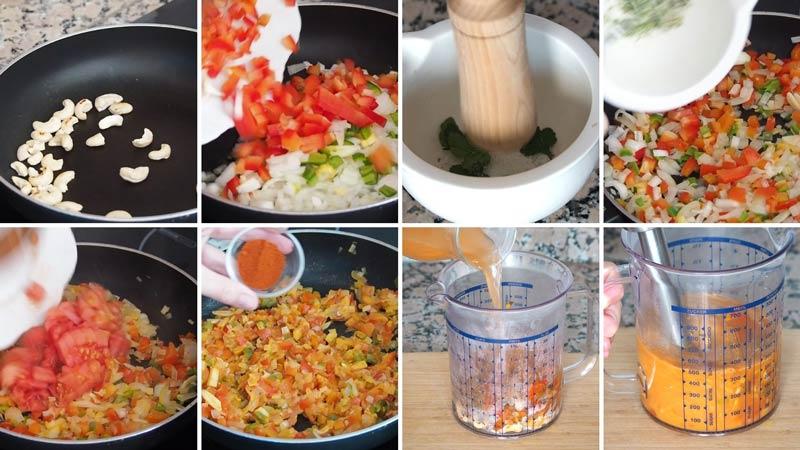 Ahora, en el vaso de la batidora, añadimos los anacardos y el sofrito. También el medio vaso de fumé que habíamos reservado anteriormente. Si no te queda fumé puedes echar un poco de agua.