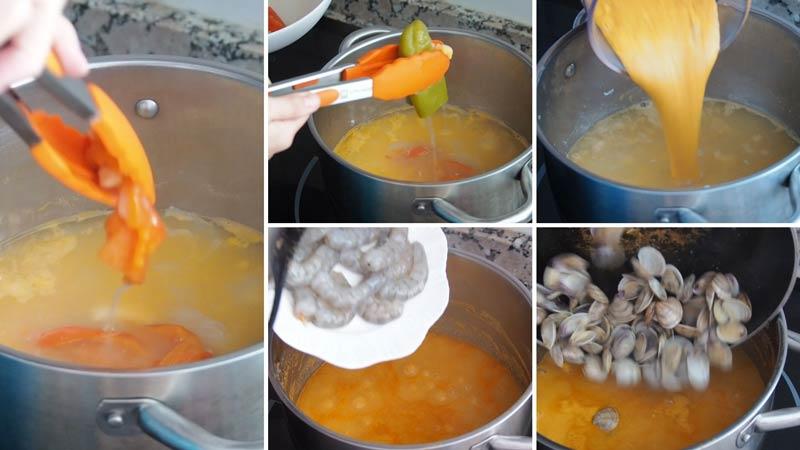Paso 7: Añadir sofrito batido, los langostinos y las almejas al potaje
