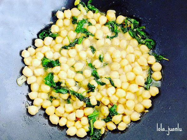 En una olla, calentamos un chorreón de aceite y añadimos la cebolla junto con el puerro y los ajos y pochamos. A continuación, le añadimos las espinacas y rehogamos. Agregamos los garbanzos y removemos.