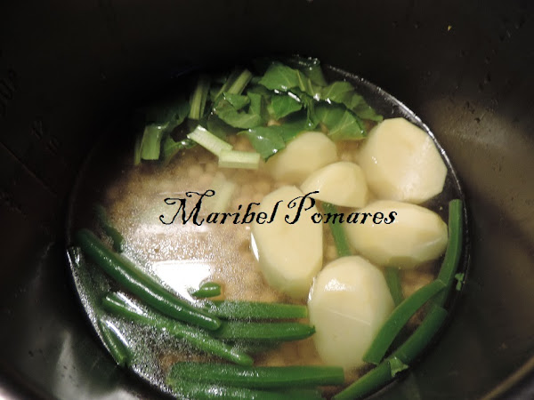Ponemos en la cubeta de la olla los garbanzos, las judías verdes, las acelgas, la patata cortada en trozos.