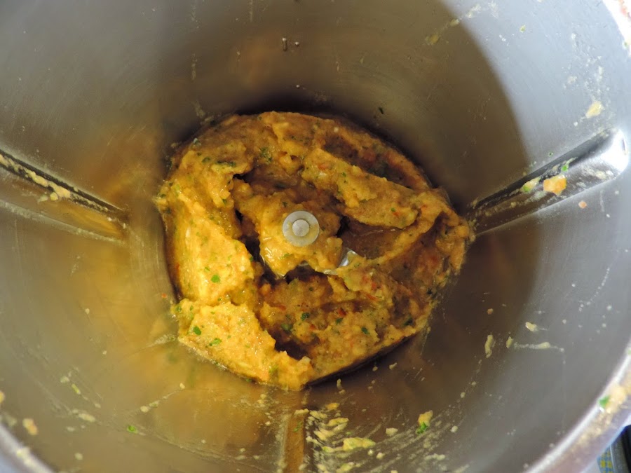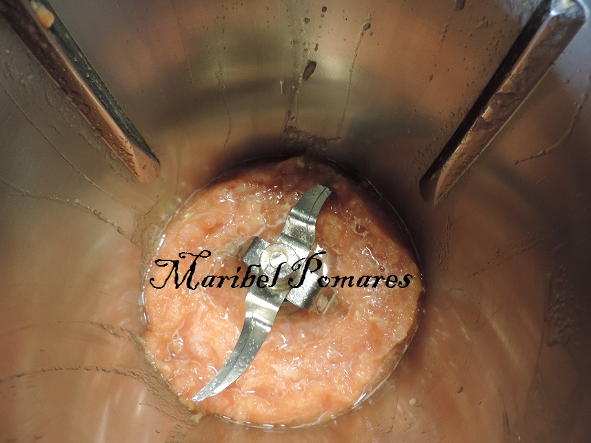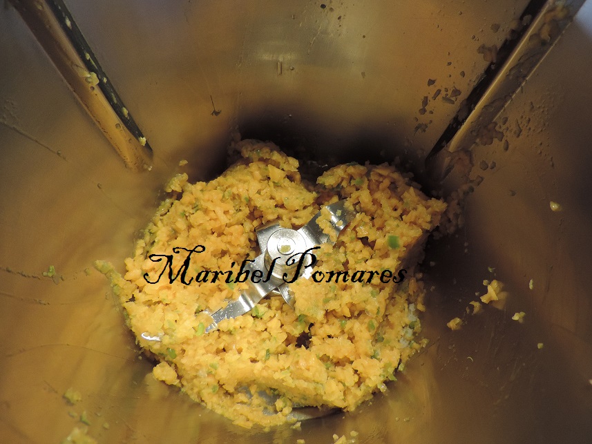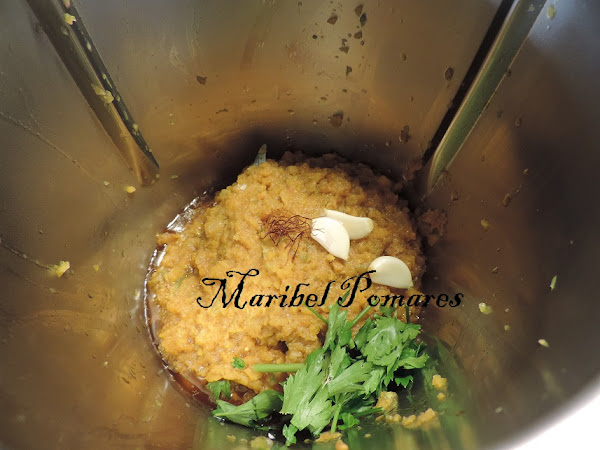 Sacamos y lo ponemos de nuevo en el vaso del thermomix, añadimos los dientes de ajo, perejil y azafrán.