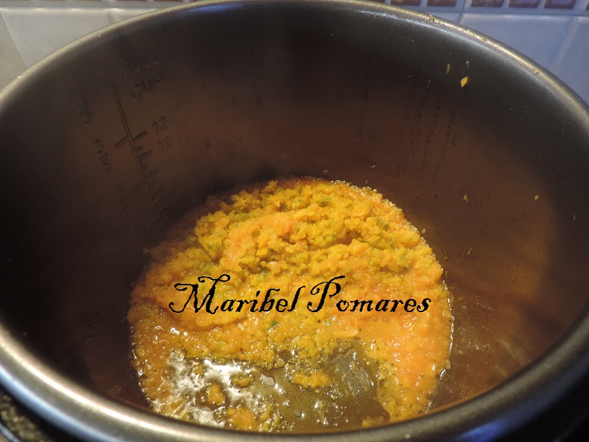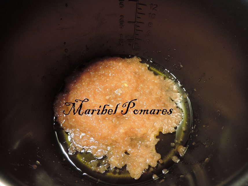 Ponemos el aceite de oliva, la cebolla y el tomate picados en la cubeta de la olla programable.