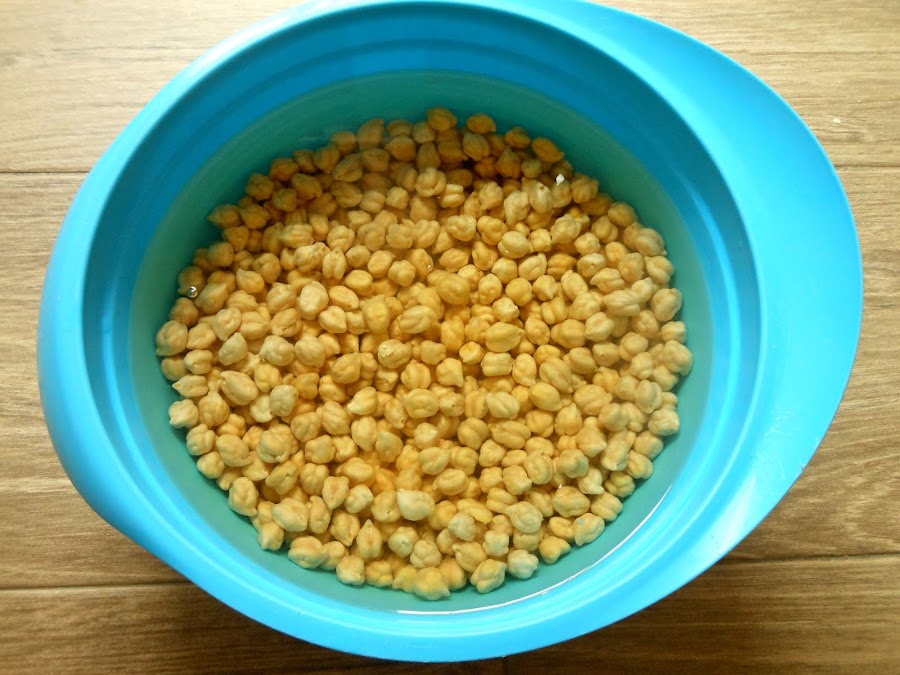 La noche anterior a la elaboración del plato sumerge los garbanzos en un bol con abundante agua (el agua a temperatura ambiente) y déjalo reposar de 10 a 12 horas.
