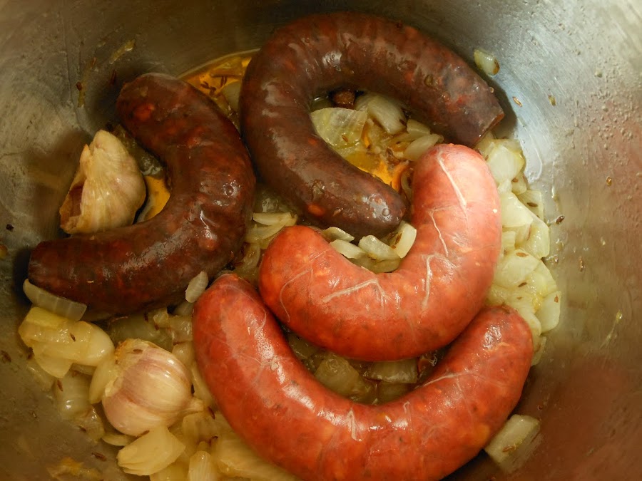 Seguidamente añade los chorizos y las morcillas y sofríelas durante 2 minutos, dándoles la vuelta a mitad de cocción para que se doren por ambos lados.