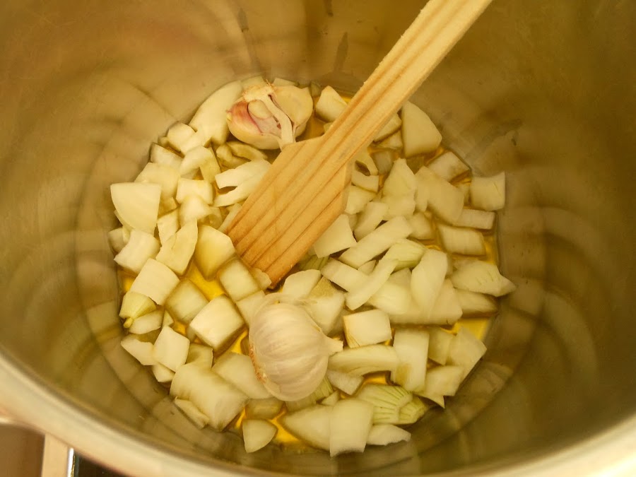 Cuando el aceite esté caliente añade la cebolla troceada y la cabeza de ajo partida en dos junto a una poquita de sal fina. Sofríe las hortalizas durante 5 minutos removiendo de vez en cuando con tu cuchara de madera.