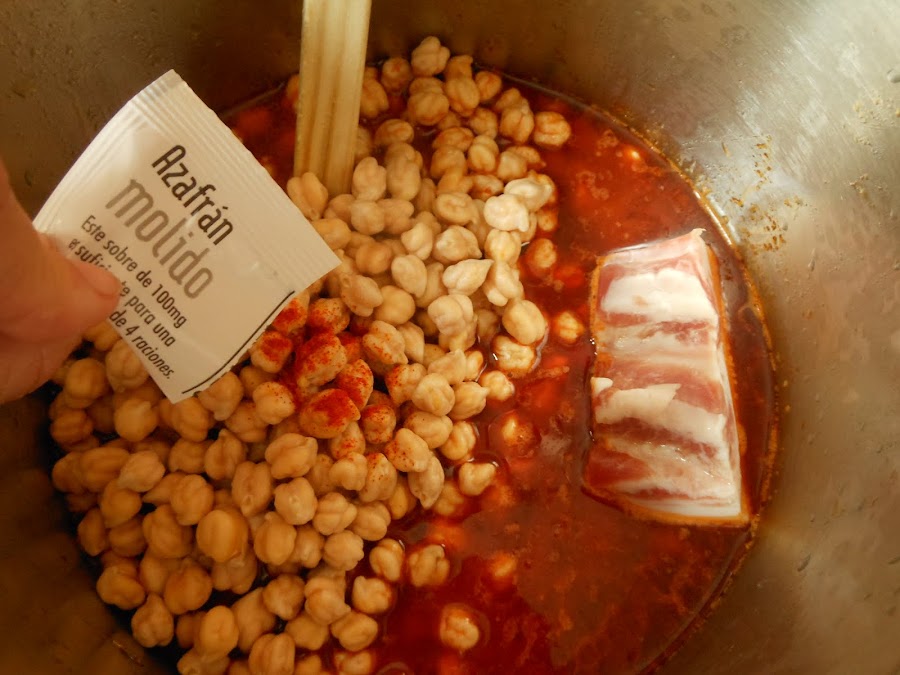 Después agrega a la olla los garbanzos, el trozo de panceta, el sobrecito de azafrán y la sal fina.