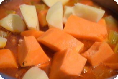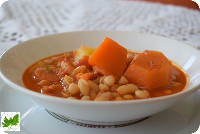 Cuece por espacio de 1 hora. Cuando estén casi tiernas, añade la patata chascada y la calabaza troceada. Los tiempos de coción pueden cambiar según la dureza de los ingredientes. Siempre hay que tenerlo en cuenta.