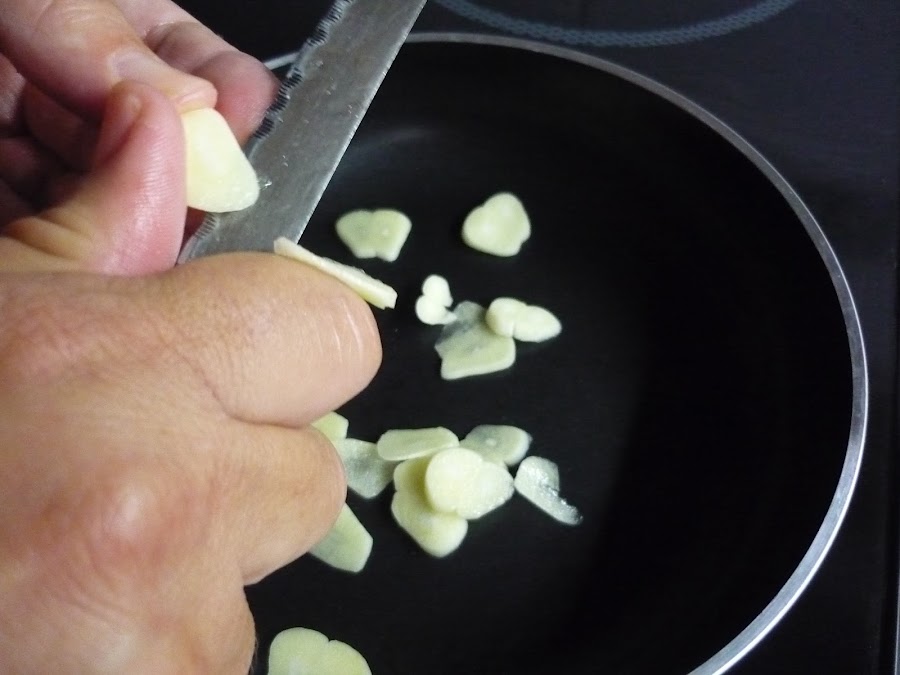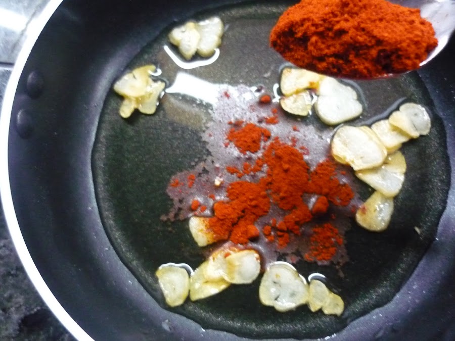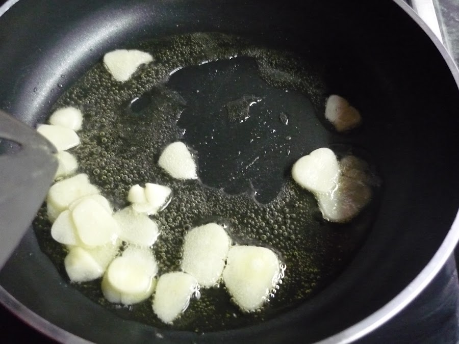 4.- Freímos el ajo cortado en rodajas y cuando esté doradito, retiramos del fuego y agregamos el pimentón y removemos. Lo echamos a la olla.