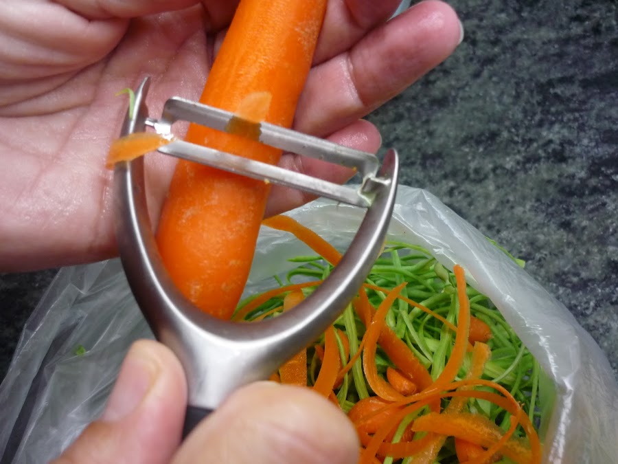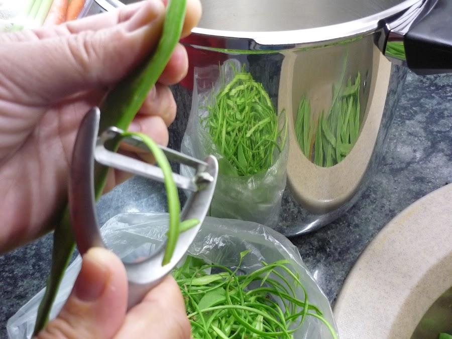 2.- Pelar las habichuelas quitando las hebras laterales. Cortarlas en juliana.