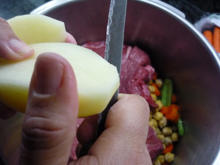 3.- Ponemos en la olla rápida, las habichuelas, los garbanzos, la zanahoria pelada y cortada en rodajas, las patatas en gajos y la carne entera.