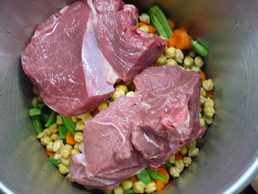 5.- Cubrimos con agua los ingredientes. Tapamos y ponemos al fuego 15 minutos en olla rápida, o 35 en olla express normal.