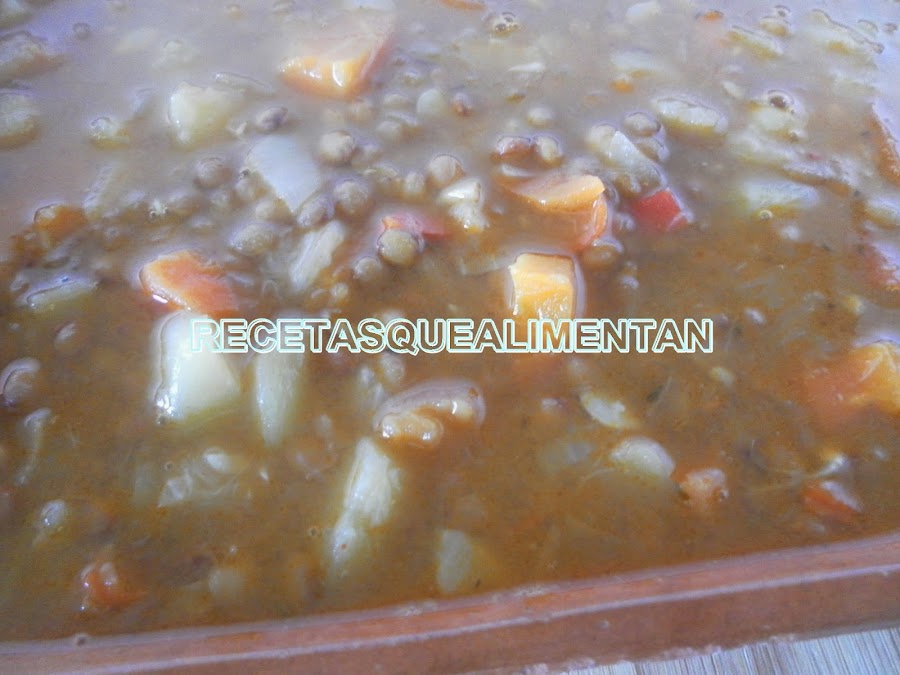 Añadimos las lentejas, el pimentón dulce y el agua en cantidad suficiente (dos dedos de agua por encima de los ingredientes).